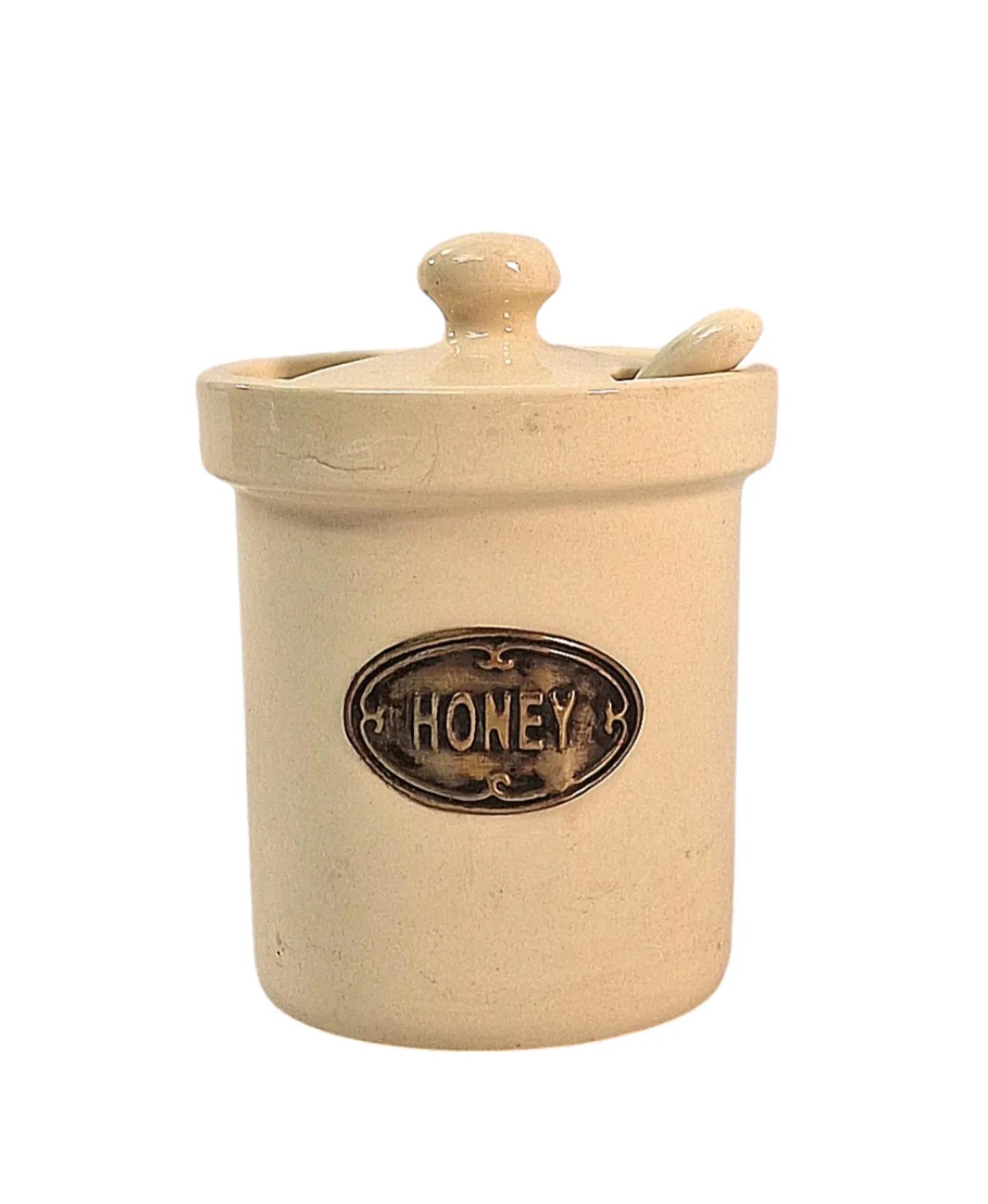touch of vintage charm. Perfect for those who appreciate timeless, rustic style with a modern twist. A gorgeous ceramic honey jar, complete with spoon. Overall measurements: D9.5 x H12 x W9.5cm